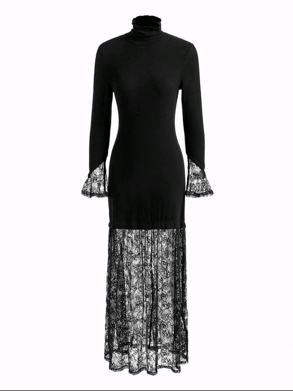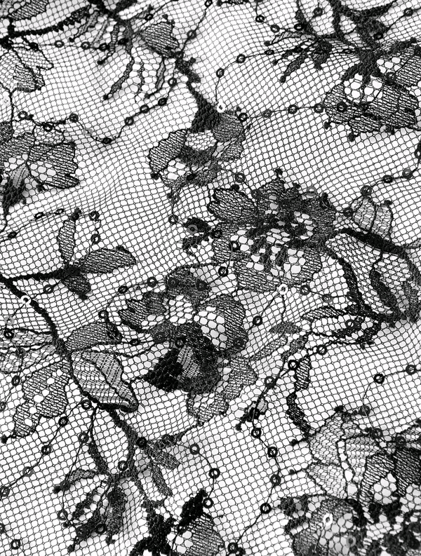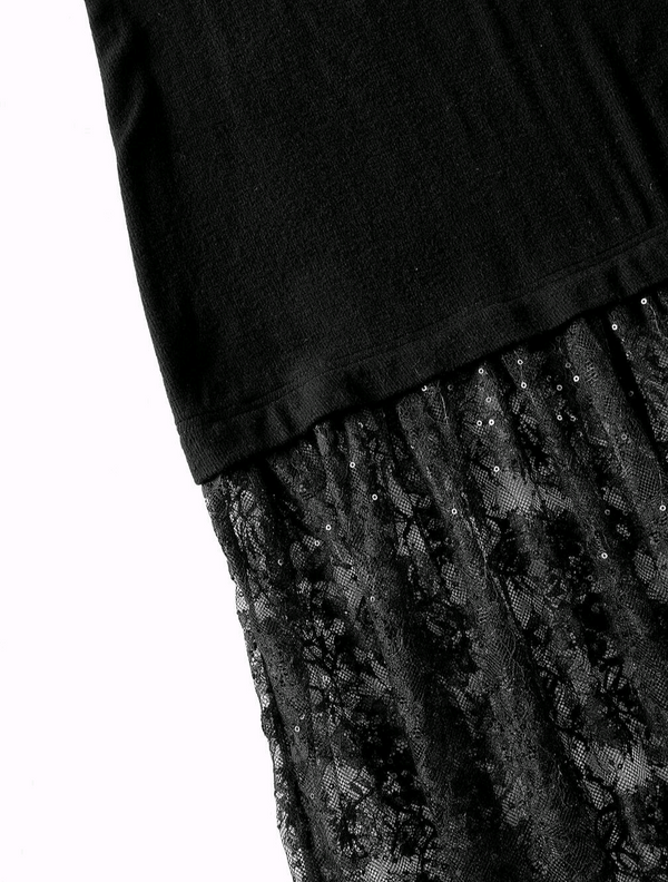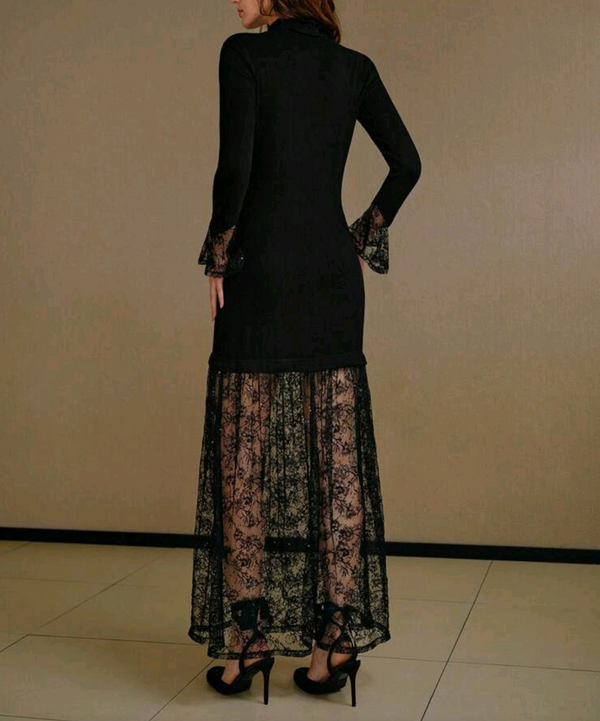 This elegant slim dress had a beautiful Italian Lace fishtail with touches of sequins intertwined within.  Polyester + Italian Lace  Model is wearing a S
