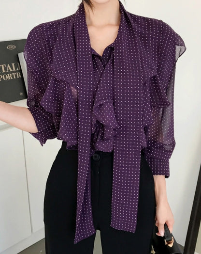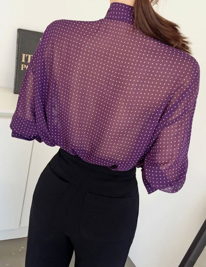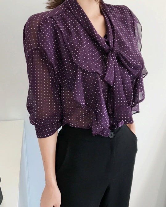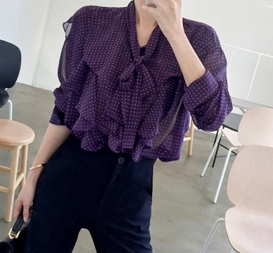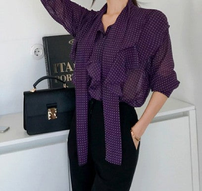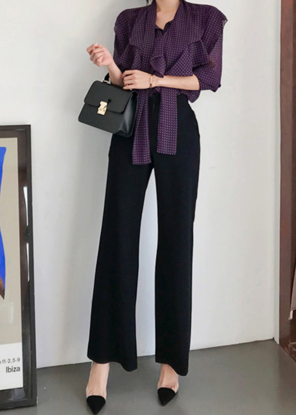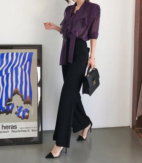 Classic high waisted pants, paired with a chic chiffon polka dot blouse. Include pants and blouse. Chiffon + Polyester Model is wearing a Small